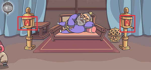 第四关:如下图所示,在董卓被惊醒之前,同时按住董卓床边的两处灯火,让房间陷入漆黑即可通关了。