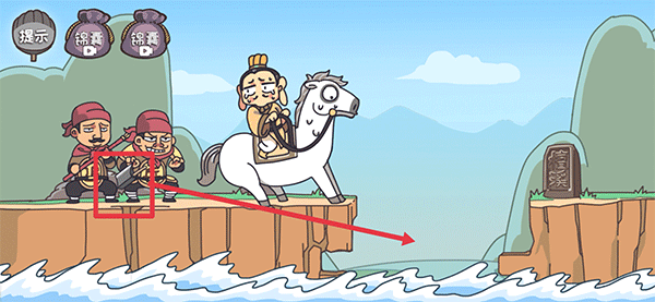 第五关:点击长按住的卢马的缰绳,将其拖拽到对面的檀溪石碑上即可解锁刘备套住檀溪碑过河的第一个结局。