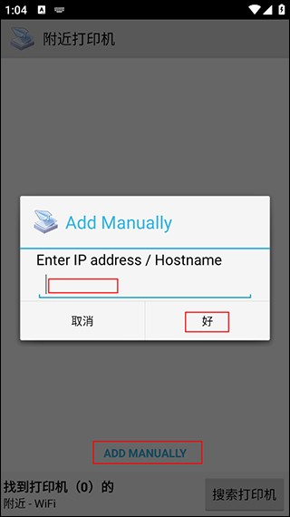 5、在【搜寻附近打印机】页面,点击【Add Manually】,输入打印机地址并确认,连接成功后即可直接打印。
