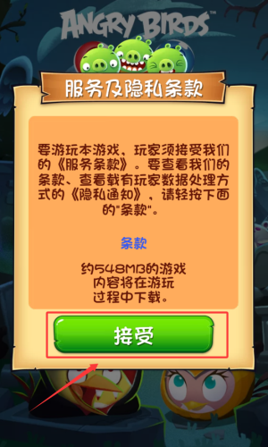 1、点击接受按钮,确认服务及隐私条款开始游戏。