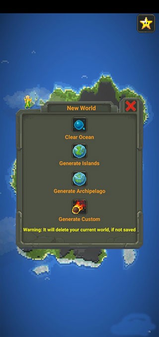 自定义生存世界,发挥你的想象进行添加元素,包含水、沙子、土壤、森林、人类、种子、动物等一系列创造物,真实模拟的温度、降雨,运送,岩浆等自然条件,用免费工具、魔术和画笔来构建像素艺术世界,帮助他们生存、发展和建设强大的文明!