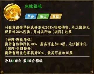 最后核心神·马云禄可以在队友的保护下依靠一技能【冰魄银枪】的【破阵】效果,叠加减防和增伤,击溃敌军防线。