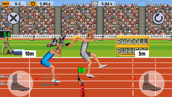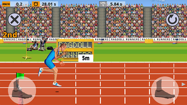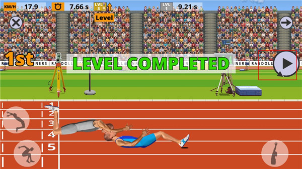 2、根据游戏中的障碍物或者运动时机进行有节奏的按键,并且在物理引擎的条件下控制好方向。游戏中主要操控运动员的两条腿,每条腿都会有一个按钮。
