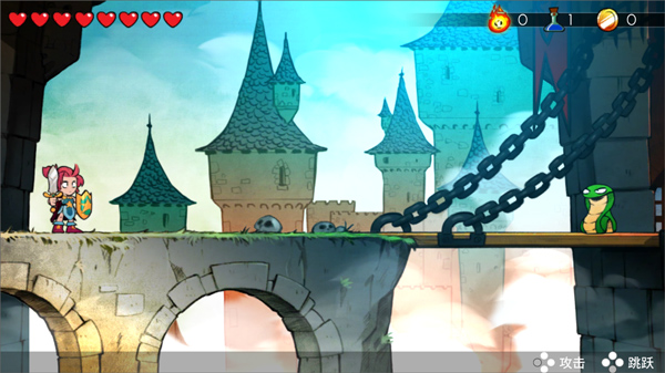 进到最终决斗的关卡,现在身上装备全满,攻防最高,血槽有八颗心,实力是最强状态。其实这里是上手关,让玩家熟悉一下移动和战斗的操作。