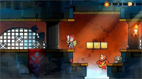 第二幅场景,由于狮人的跳跃能力有限,只能破开砖坡通行,身后的两排火球无法全部抵挡,因此只有埋头搬砖以求快速通行。将三只蝙蝠引下来清掉,踩三只踏板跳过去。
