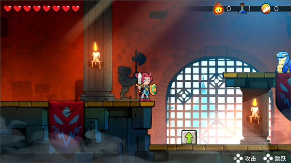 前面是连续的几道小平台,有两只红蝙蝠干扰,你可以附在平台边缘挥剑斩杀,也可以利用它们飞低的时候跳到下一道平台。