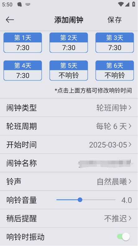 功能亮点:仅需设置一个闹钟,即可在轮班周期内按预设时间自动响铃,无需反复开关多个闹钟,彻底解决轮班人群的痛点。