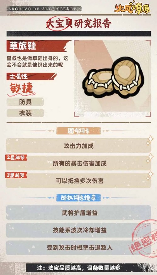 草鞋作为防具,固有词条都不弱,适用于敏捷型武将,随机词条可根据自己需要,自行搭配。
