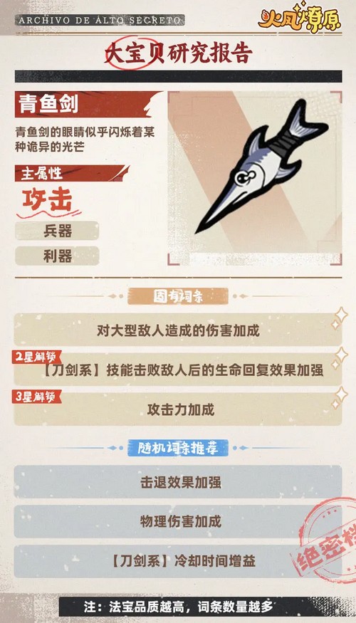 刀剑系法宝,适用于张辽,孟坦这样的刀剑型武将,推荐词条和偃月刀没有太大的区别,获得了即可使用哦。