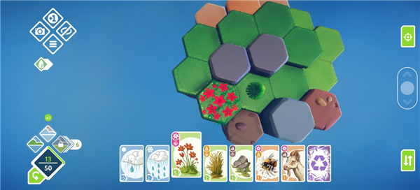 5、之后达到和谐点获得卡牌,我们就可以放置树木、动物等内容在地图中(放置3个相同内容可以合成一个生态)。