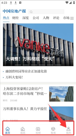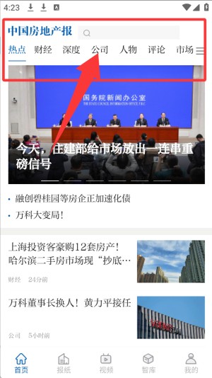 打开App后,优先查看顶部导航栏或首页的分类标签(如政策、市场、房企、土地等)。