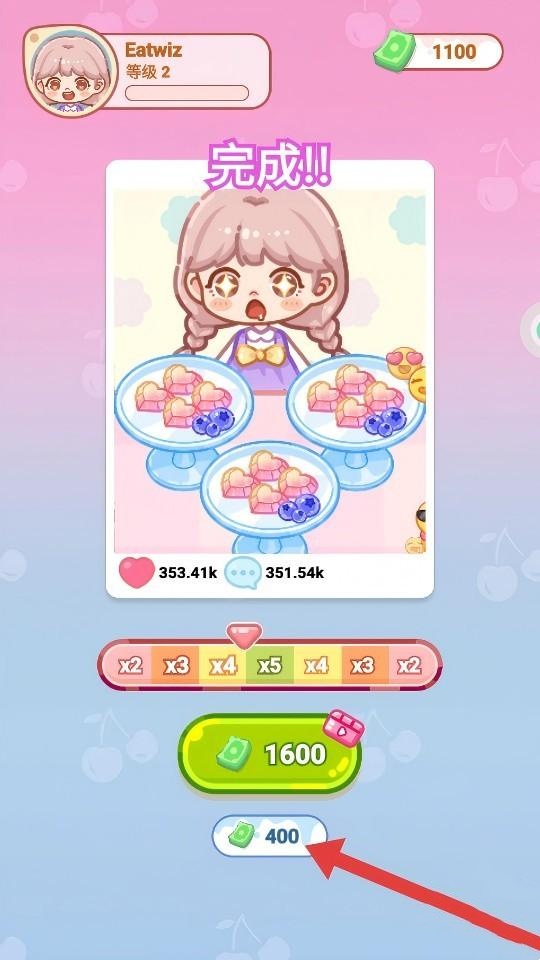 4. 直播圆满结束后,会出现【完成!!】的提示界面,此时点击领取如【400】等奖励,这些奖励可用于解锁全新甜品或对直播设施进行升级。