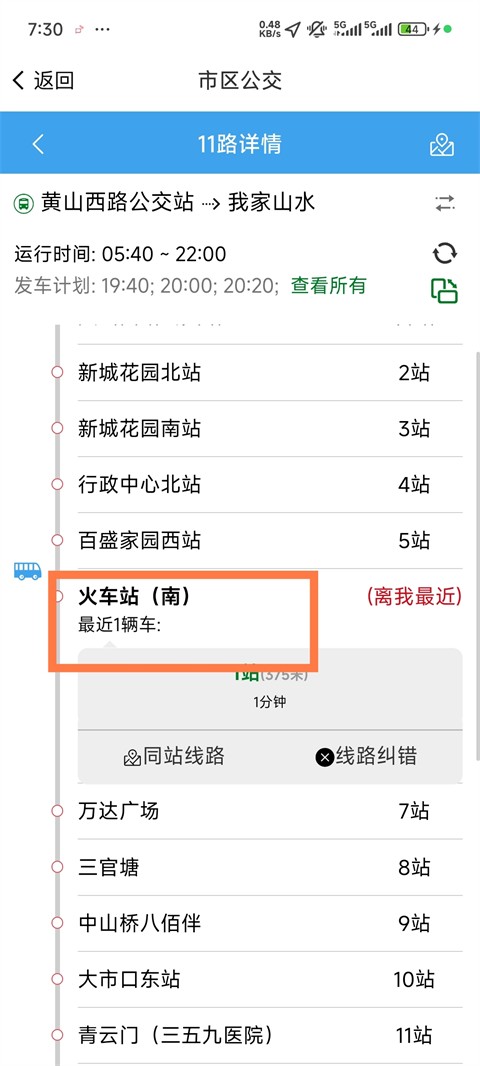 选中线路后,地图显示车辆实时位置、到站时间及距离当前站点的站点数。