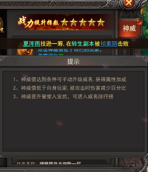 3、攻击神威值低于自身的玩家,伤害可额外增加