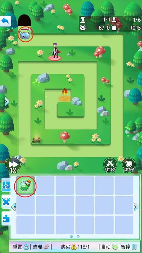2、游戏中需将英雄放置在最佳位置,面对敌人来袭时,英雄将自动进行攻击,同时可利用金币为英雄回血或提升攻击技能,确保战斗效率。