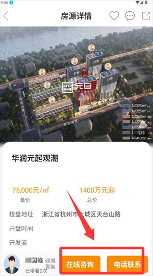 3.在详情页点在线咨询或电话联系,进一步了解房源。