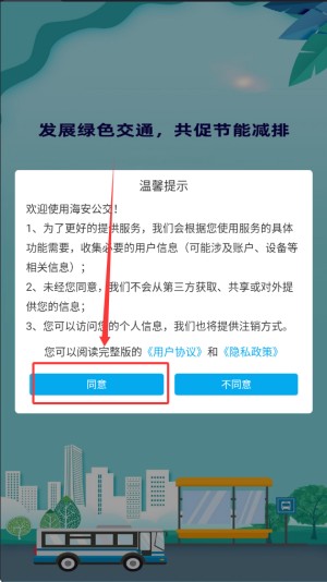1.先确认服务协议,就能进入海安公交 app 主界面,开启完整使用。