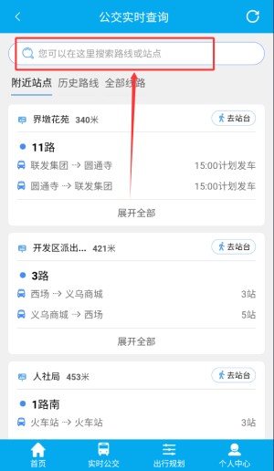 4.在实时公交模块搜线路编号,可看车辆位置和到站时间。