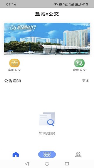 2.登录后进入首页,能看到实时公交、定制公交等服务,还有最新公告通知。