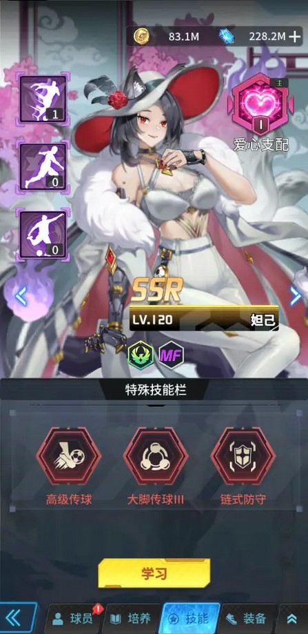 妲己:盘带灵巧,技能“爱心支配”可造成眩晕,与嫦娥同场强化传球与头球上限。