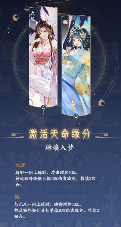 鲲与九尾一同上阵时,触发天命缘分【琳琅如梦】:九尾的攻击增加10%,神通额外降低敌方10%的伤害减免;鲲的防御增加10%,神通额外提升友方10%的伤害减免。