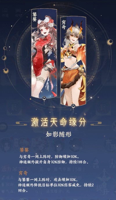 穷奇与饕餮一同上阵时,触发天命缘分【如影随形】:穷奇攻击增加10%,神通额外降低目标单位10%伤害减免;饕餮防御增加10%,神通额外提升自身10%防御。