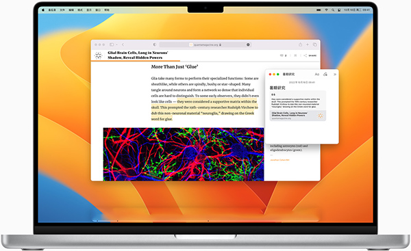 Safari 浏览器内置众多工具,带来更引人入胜的浏览体验,用起来更直观,响应也更迅速。不必切换其他软件,就能选择任意图片中的文字,瞬间翻译整个网页的内容,还能在网站的任意位置快速记笔记。