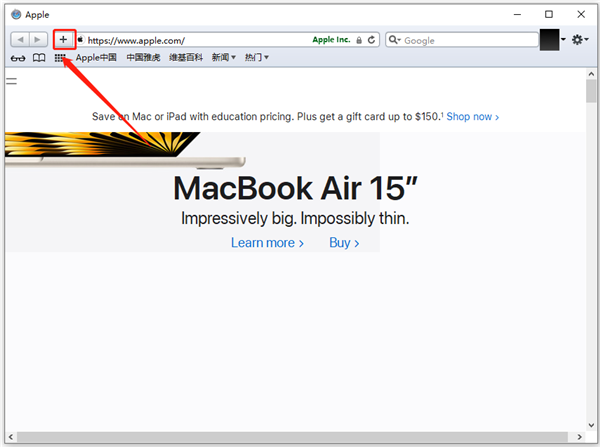1、打开想要收藏的网页后,点击上方地址栏左侧的“+”按钮。