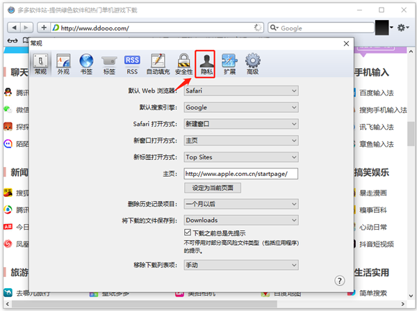 3、将打开的新窗口切换至“隐私”标签页。