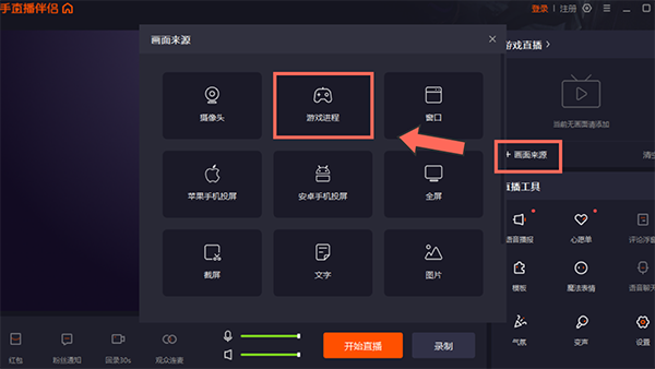 2、下载并安装后,在伴侣内【添加画面来源】时选择【游戏进程】
