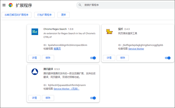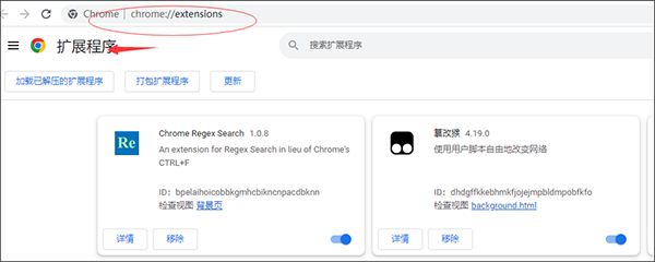 同上述第一步,通过「更多工具」→「扩展程序」或直接访问 chrome://extensions/ 进入。