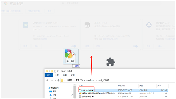 找到本地下载的 .crx 格式插件文件,从资源管理器中拖动至扩展管理页面中央空白区域,此时页面会显示安装提示。