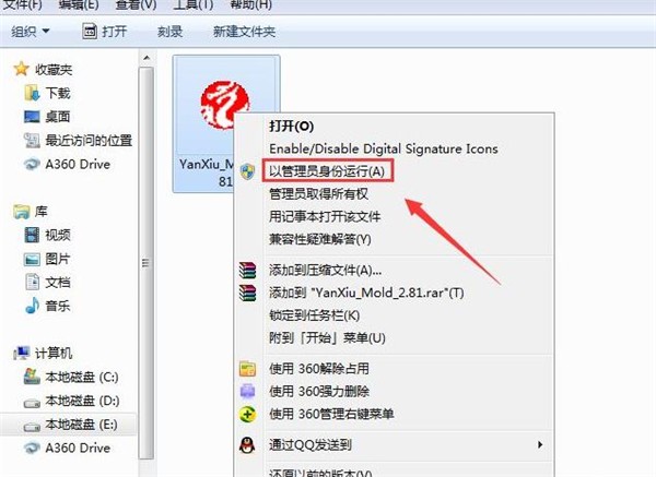 找到燕秀工具的安装文件,单击鼠标右键选择以管理员身份运行选项,如图所示: