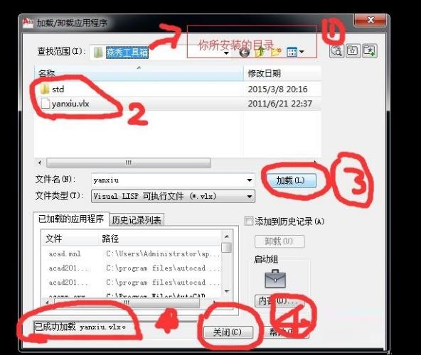 3、前两个步骤试了后还是没有则 工具→加载应用程序→找到你所安装燕秀工具箱里面的yanxiu.vlx文件点加载跟着关闭就行了 附图