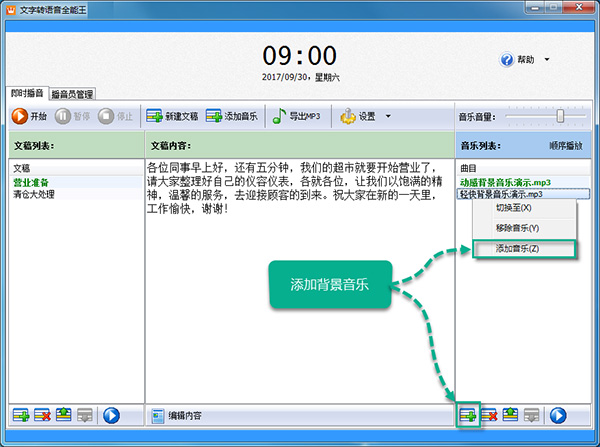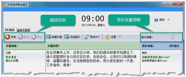 文字内容和背景音乐都添加进软件了,那么我们开始播音吧,点击左上方播放控制区的“开始”按钮,即可开始语音和背景音乐的播放,语音会不断的循环播放,音乐会顺序或乱序播放。在播放时,您还可以点击“暂停”或“停止”按钮来暂停或终止播放。