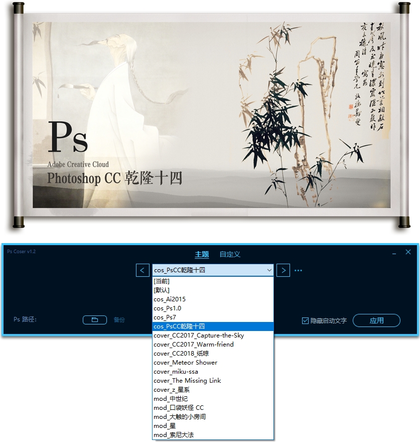 Ps Coser是个便捷实用的Photoshop启动图修改工具,用户要知道PS的安装路径,可任意的修改启动画面,丰富的界面资源可以选择,实时更新内容,喜欢学习设计的朋友们可以来体验,启动PS无数次,每一次启动都是单一的画面,管理启动画面、文字等等,还能修改更多Photoshop内部图片。