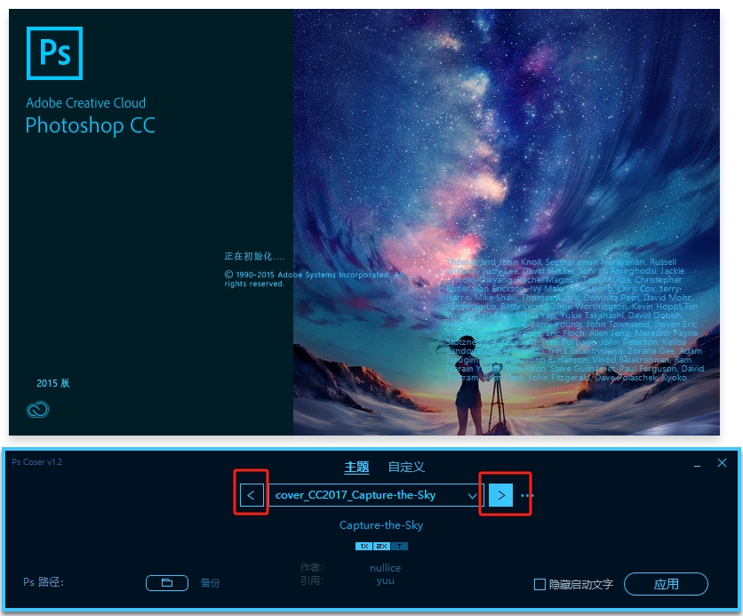 2、新的 PhotoShop CC 2017 更新了, Ps Coser 第一时间进行了更新,目前支持修改和提取 CC 2017 的启动图了,但是 CC 2017 对语言文件夹做了数字签名也就是说目前无法隐藏修改启动文字了,之前为 CC 2015 制作的主题用在 CC 2017 上会因为有启动文字很难看了,有时间再研究下隐藏启动文字的新方法。8