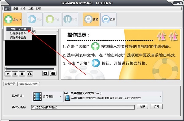 1、打开已下载好的佳佳全能视频格式转换器软件,然后需要点击左上角的添加按钮,在出现的选项中选择添加一个文件。