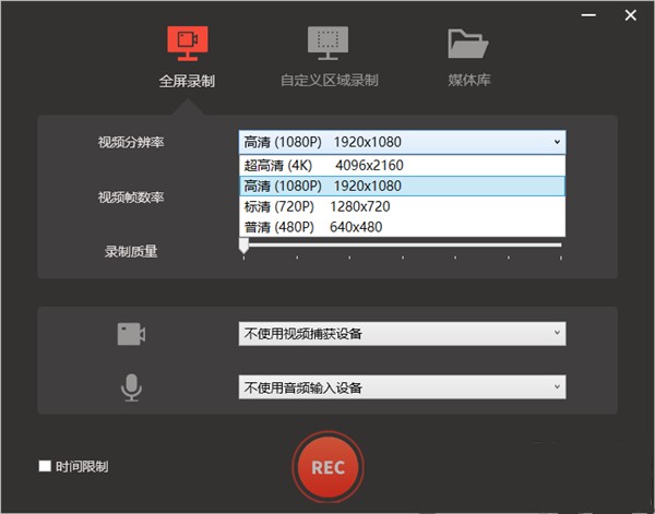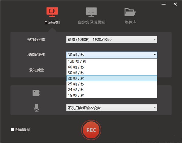 1、双击软件进入软件全屏录制操作页面,该页面可以点击设置视频分辨率、视频帧数率等功能操作。