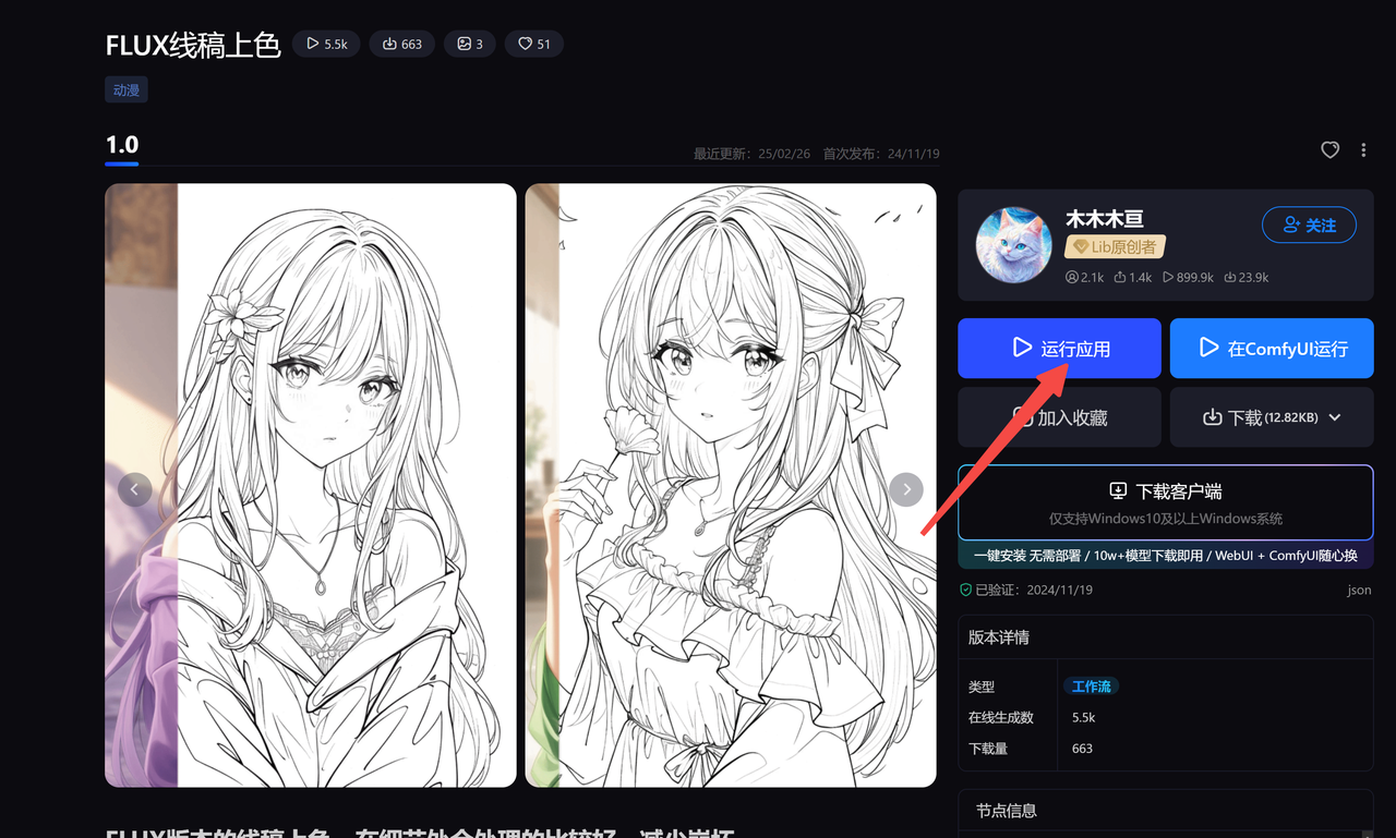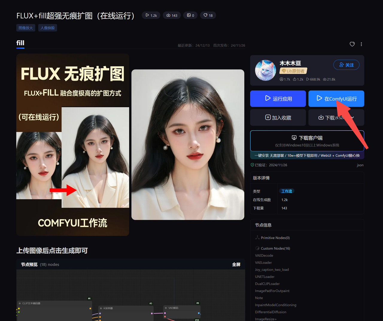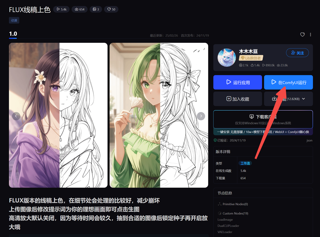 关于 ComfyUI工作流的使用,进入推荐工作流主页,点击右侧蓝色「在ComfyUI中运行」。