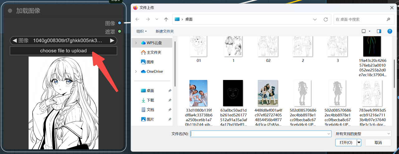 第一步,在 ComfyUI 操作界面中,找到「加载图像」节点,点击 「Choose File To Upload 」上传我们的线稿图。