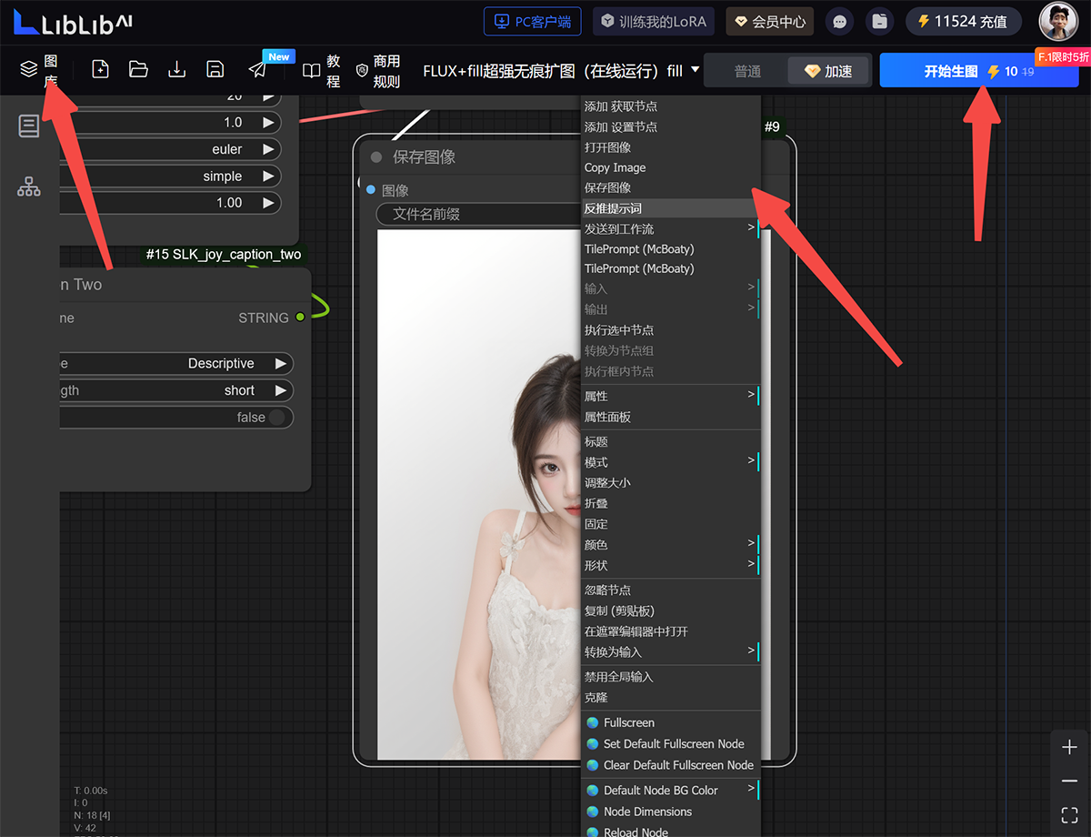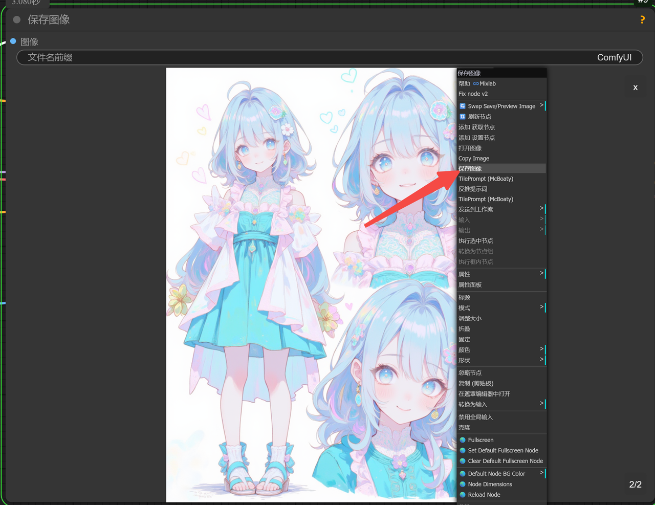 第三步,图像生成完毕后,找到右侧的「保存图像」节点,将鼠标放图像上单击右键,在弹出的列表中选择保存图像即可。