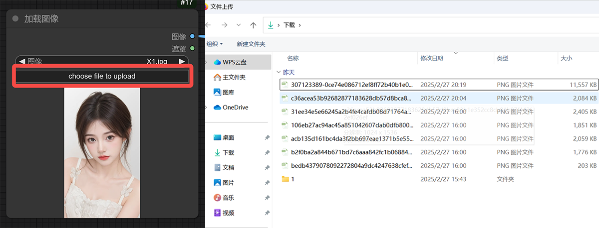 找到第一个节点「加载图像」,点击「Choose File To Upload」上传需要扩图的图像。