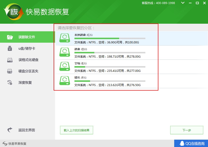 第二步,运行快易数据恢复,选择“误删除文件”。