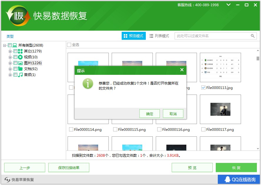第四步,扫描结束后,从扫描结果里搜索要恢复的文件,选择要恢复的文件,双击预览文件,文件预览出来的效果就是恢复后的效果,选中自己要的文件,点击"恢复"按钮即可。