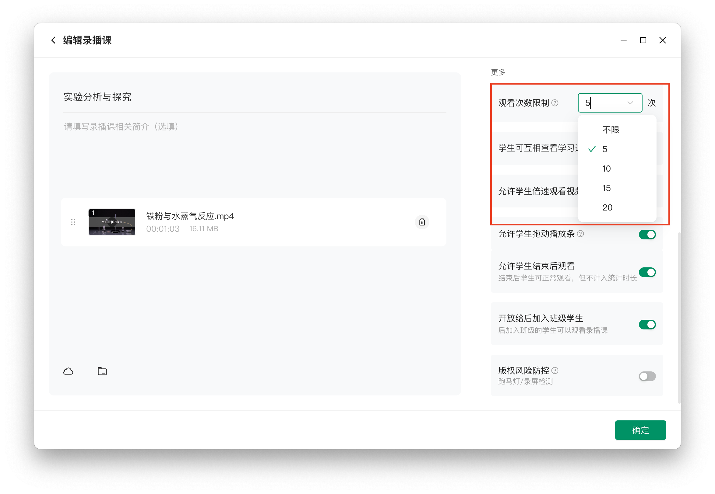 教师发布录播课时,可设置学生观看次数,让学生专注于每一次的观看学习。