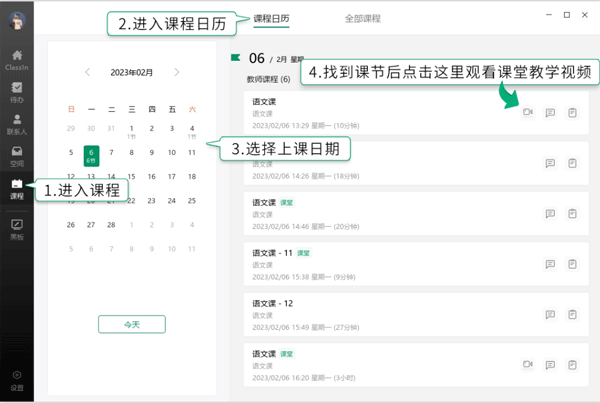 1、在课程日历上可以查看所有可成,点击回放图标即可观看已经录课的课堂视频,支持倍速播放,切换观看视角和选段观看