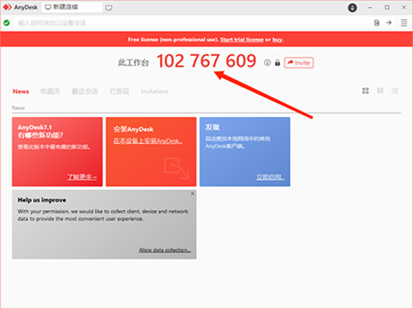 1、打开anydesk远程软件,进入软件界面,可以看到红色的ID,请记住它,这是用于远程控制的凭证,
