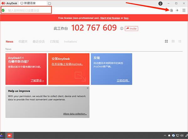 1、打开AnyDesk软件,在上方“输入目标地址以置会话”栏下输入对方用户ID,然后选择“文件传输”图标选项,