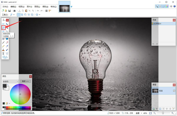 1、首先,用户在paintnet中将需要抠的图片打开,先点击左侧工具栏中的“套索选取”工具。(本文以抠灯泡为例子)